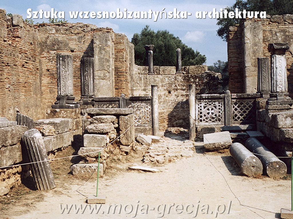 W pierwszych wiekach Chrześcijaństwa, u schyłku Starożytności, Grecy zaczęli przebudowywać antyczne świątynie (i inne obiekty) na modłę chrześcijańską, głównie poprzez zmianę wystroju wnętrz. Widać to wyraźnie w pozostałościach pracowni Fidiasza w Olimpii - wśród oryginalnych, kamiennych murów widać bizantyjskie fragmenty kolumn i zdobień.