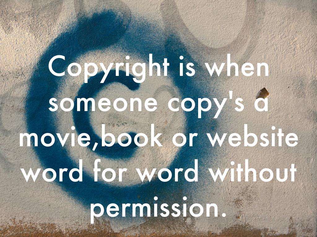 Copyright is when someone copy's a movie,book or website word for word without permission.