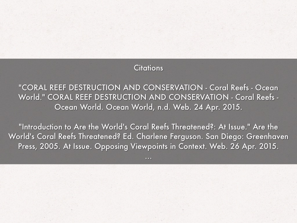 "Introduction to Are the World's Coral Reefs Threatened?: At Issue." Are the World's Coral Reefs Threatened? Ed. Charlene Ferguson. San Diego: Greenhaven Press, 2005. At Issue. Opposing Viewpoints in Context. Web. 26 Apr. 2015.
