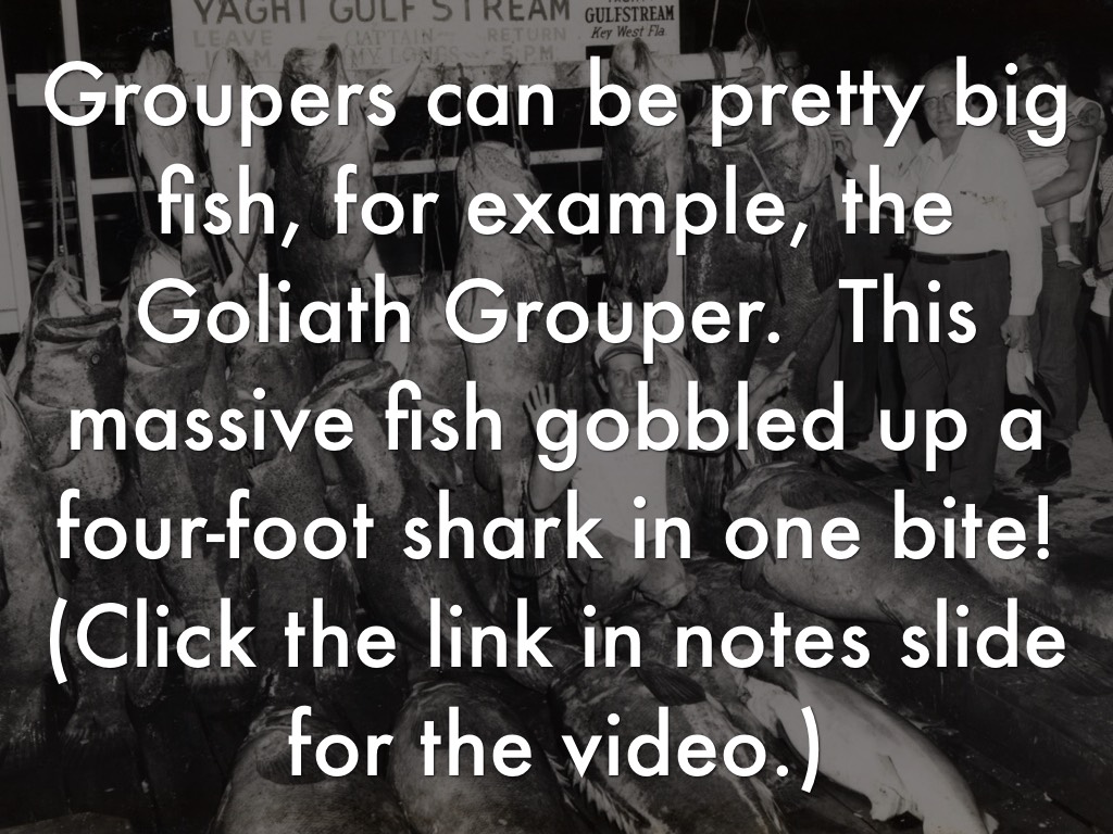Groupers can be pretty big fish, for example, the Goliath Grouper. This massive fish gobbled up a four-foot shark in one bite! (Click the link in notes slide for the video.)