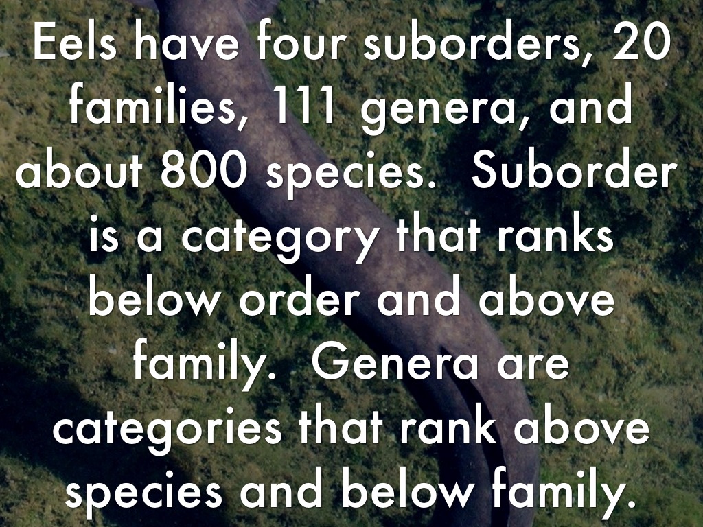 Eels have four suborders, 20 families, 111 genera, and about 800 species. Suborder is a category that ranks below order and above family. Genera are categories that rank above species and below family.