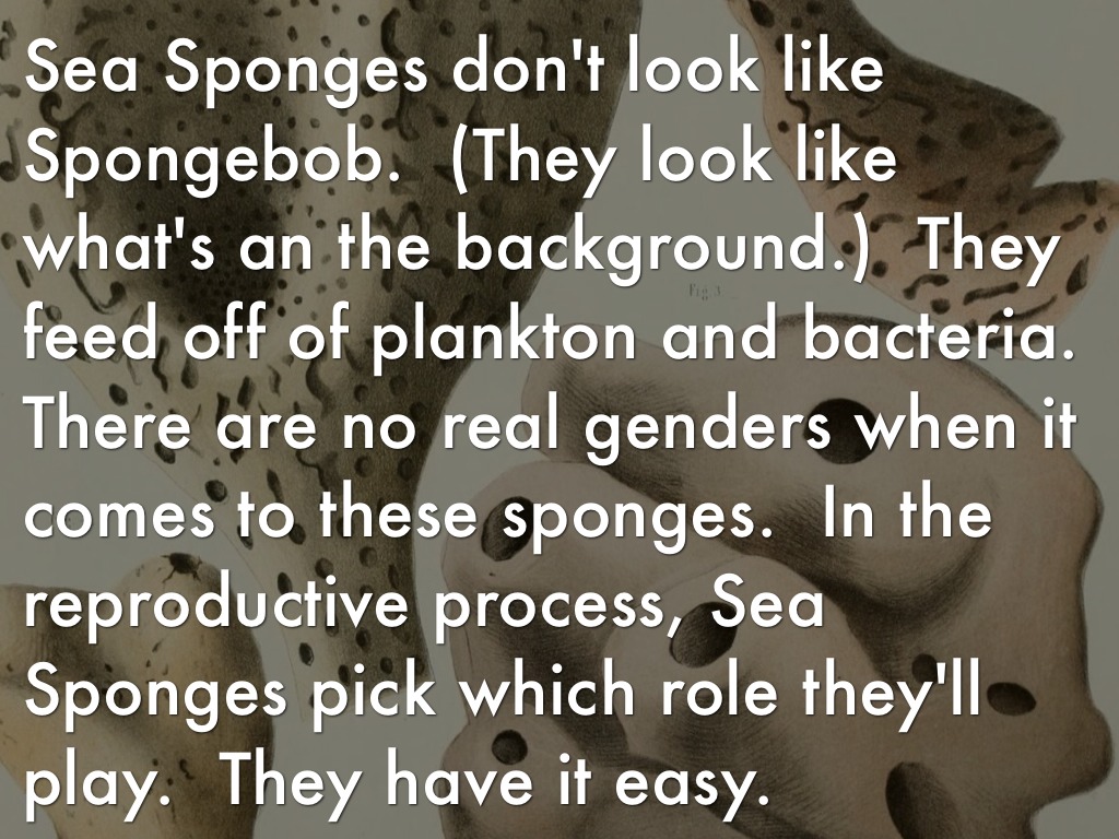 Sea Sponges don't look like Spongebob. (They look like what's an the background.) They feed off of plankton and bacteria. There are no real genders when it comes to these sponges. In the reproductive process, Sea Sponges pick which role they'll play. They have it easy.