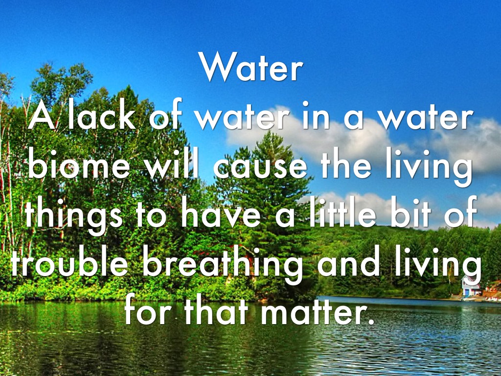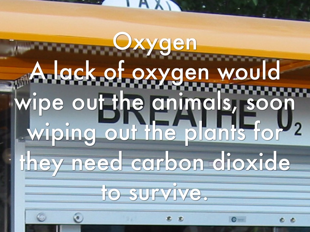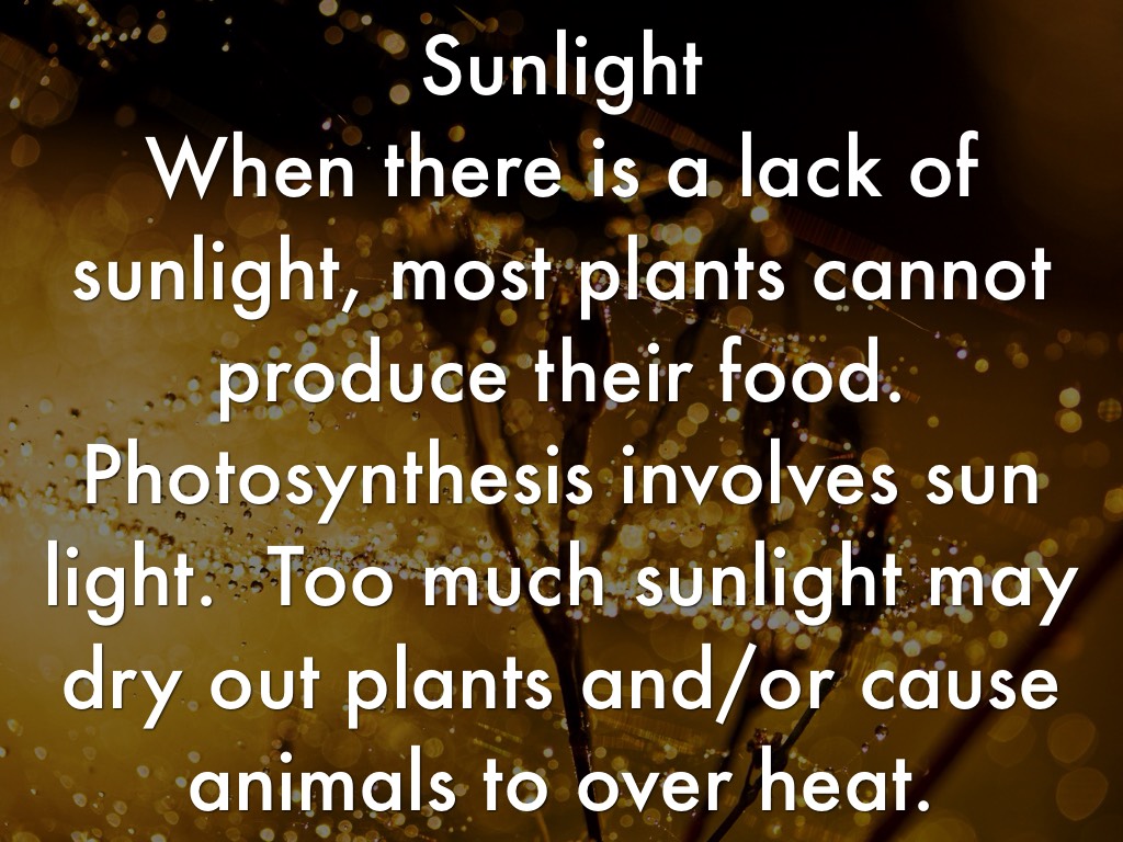 Sunlight When there is a lack of sunlight, most plants cannot produce their food. Photosynthesis involves sun light. Too much sunlight may dry out plants and/or cause animals to over heat.