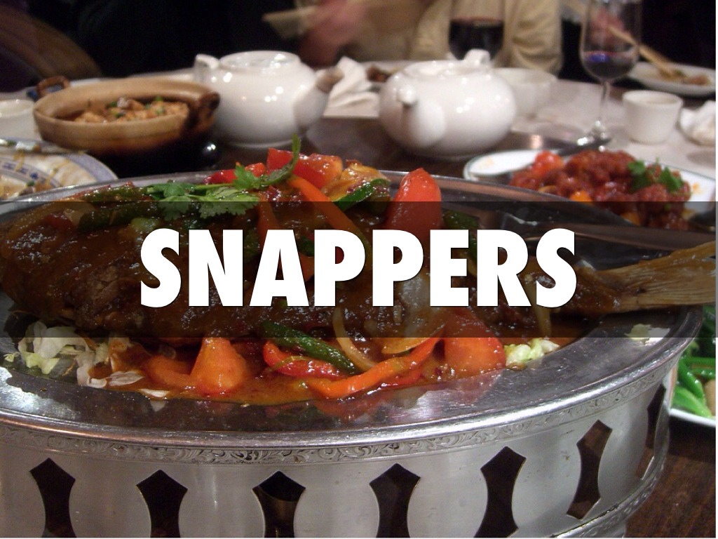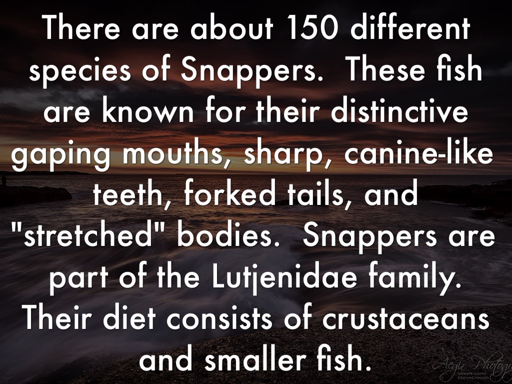 There are about 150 different species of Snappers. These fish are known for their distinctive gaping mouths, sharp, canine-like teeth, forked tails, and "stretched" bodies. Snappers are part of the Lutjenidae family. Their diet consists of crustaceans and smaller fish.