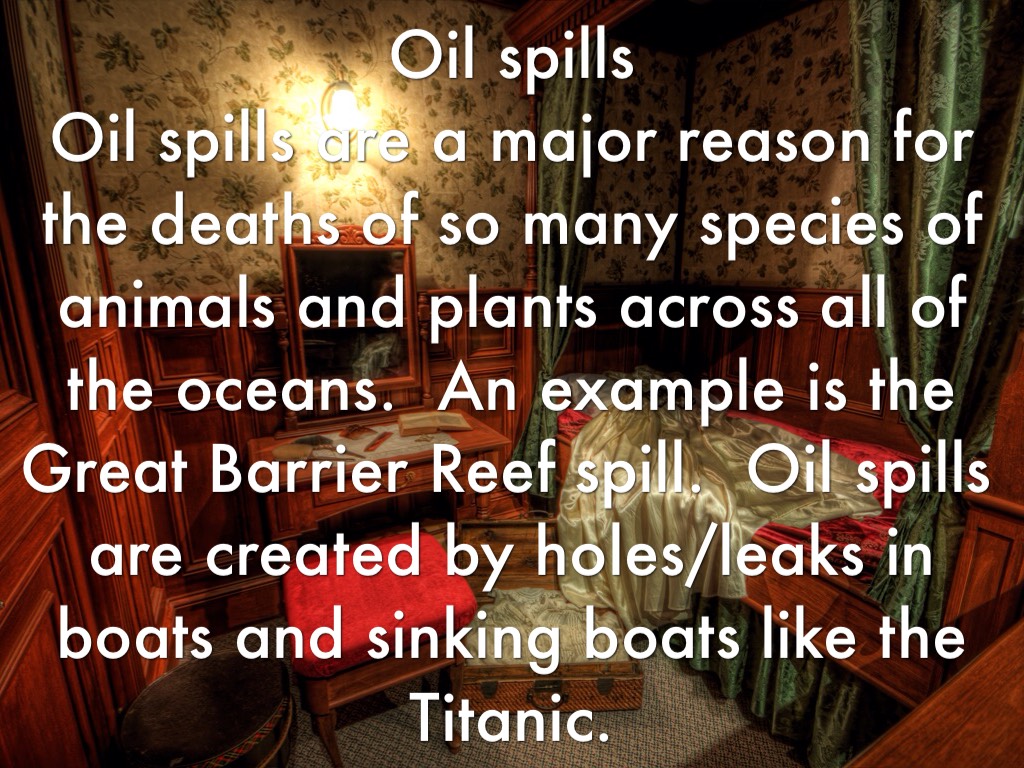 Oil spills Oil spills are a major reason for the deaths of so many species of animals and plants across all of the oceans. An example is the Great Barrier Reef spill. Oil spills are created by holes/leaks in boats and sinking boats like the Titanic.