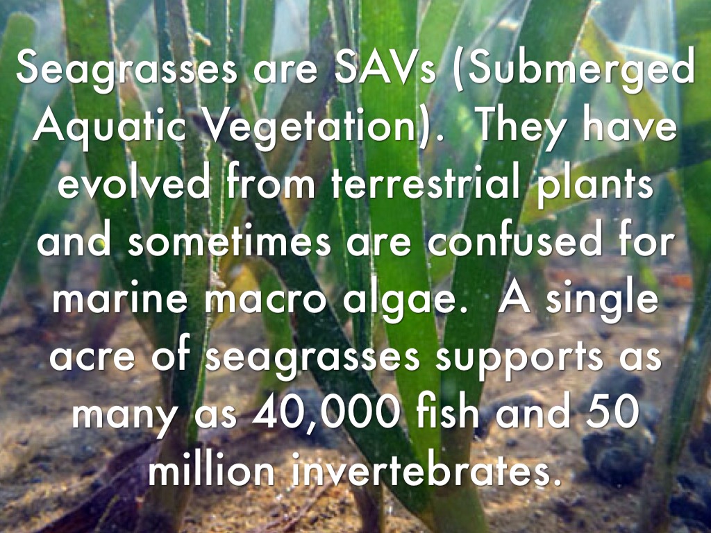 Seagrasses are SAVs (Submerged Aquatic Vegetation). They have evolved from terrestrial plants and sometimes are confused for marine macro algae. A single acre of seagrasses supports as many as 40,000 fish and 50 million invertebrates.