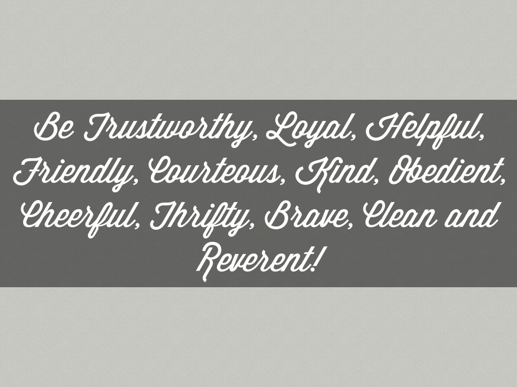 Be Trustworthy, Loyal, Helpful, Friendly, Courteous, Kind, Obedient, Cheerful, Thrifty, Brave, Clean and Reverent!