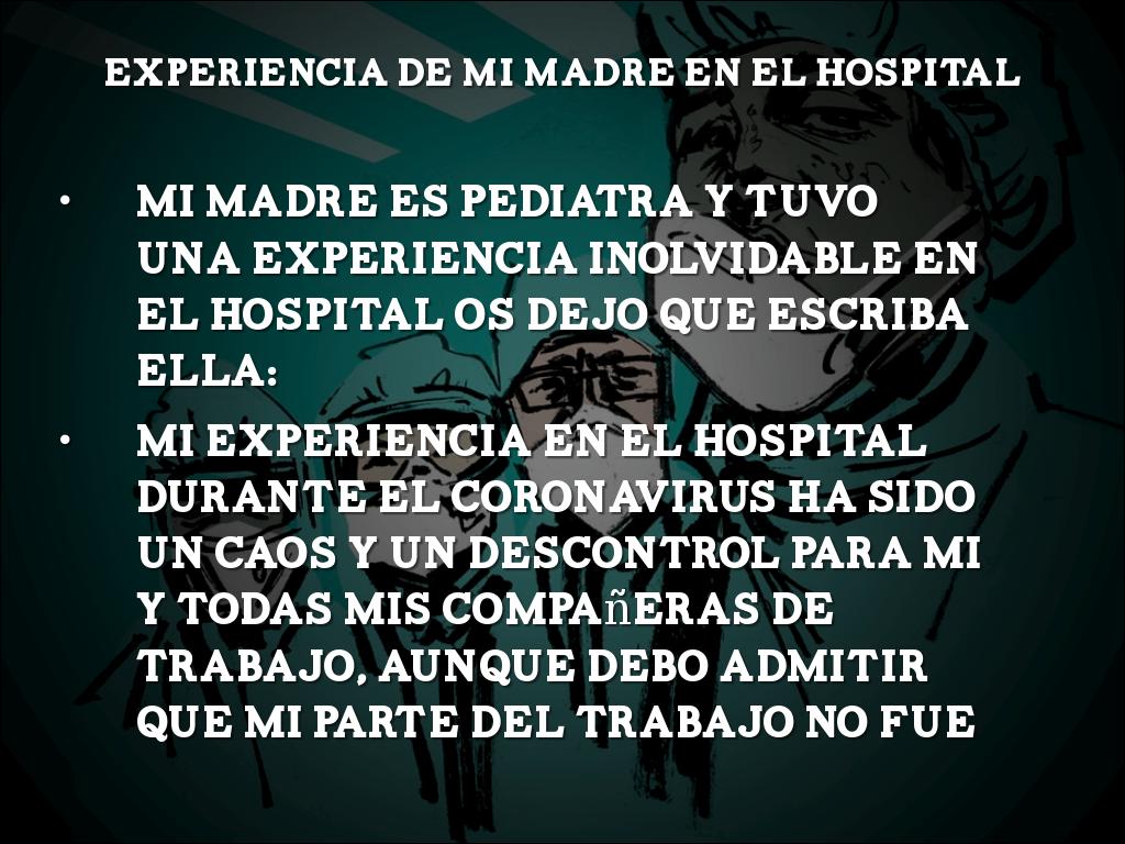 Mi experiencia en el hospital durante el coronavirus ha sido un caos y un descontrol para mi y todas mis compañeras de trabajo, aunque debo admitir que mi parte del trabajo no fue tan agobiante.