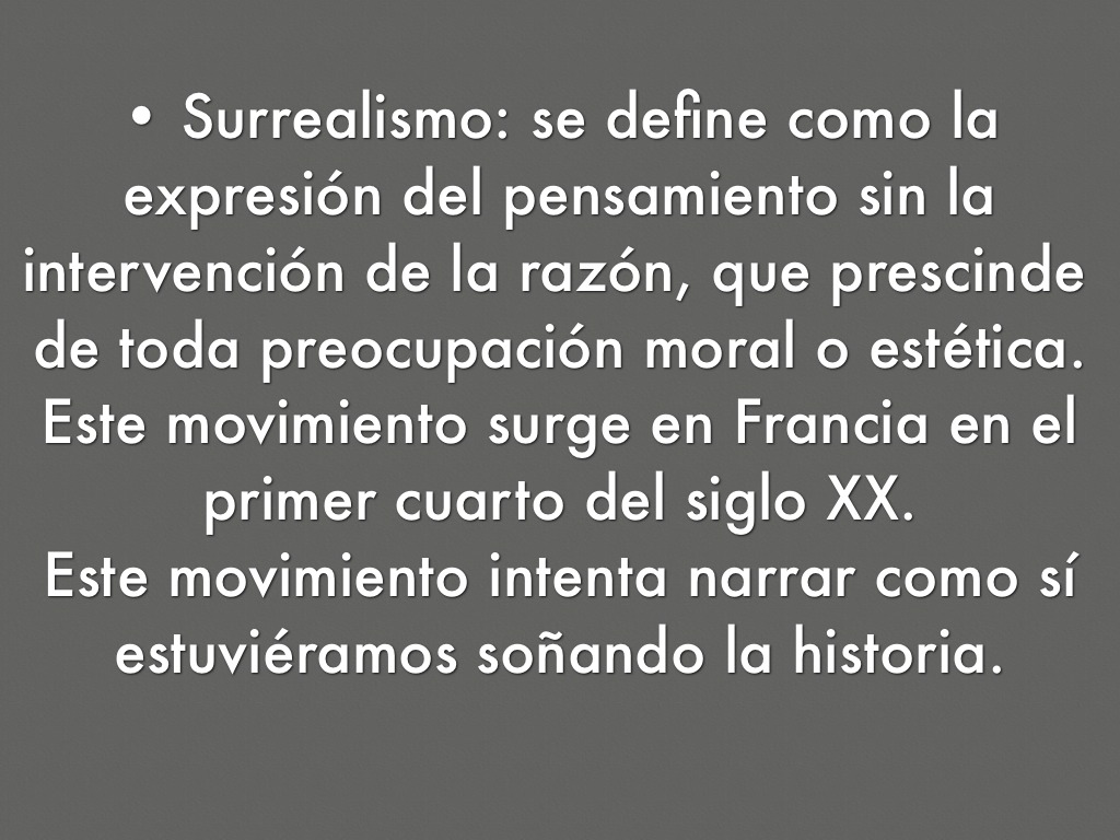 • Surrealismo: se define como la expresión del pensamiento sin la intervención de la razón, que prescinde de toda preocupación moral o estética. Este movimiento surge en Francia en el primer cuarto del siglo XX.