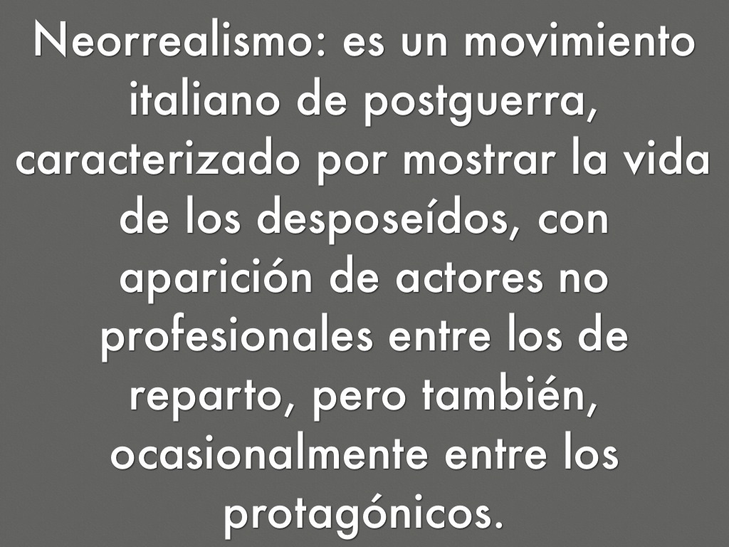 Neorrealismo: es un movimiento italiano de postguerra, caracterizado por mostrar la vida de los desposeídos, con aparición de actores no profesionales entre los de reparto, pero también, ocasionalmente entre los protagónicos.