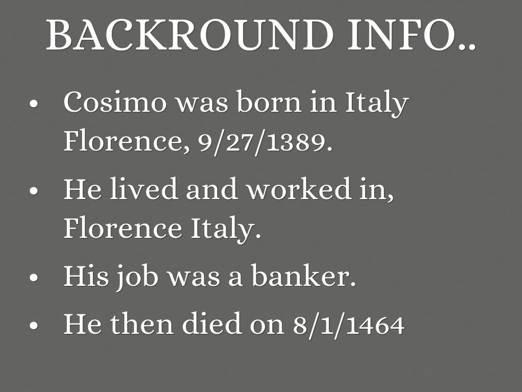 • Cosimo was born in Italy Florence, 9/27/1389.