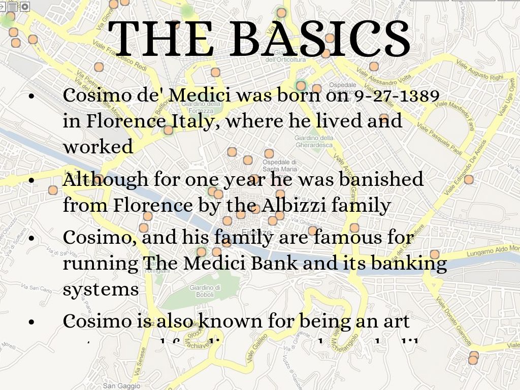 There were also branches of the bank in different parts of Europe. Branches that were added while Cosimo was in charge include: London, Geneva, Bruges, Avignon, Milan, and then later Geneva was transferred to Lyon
