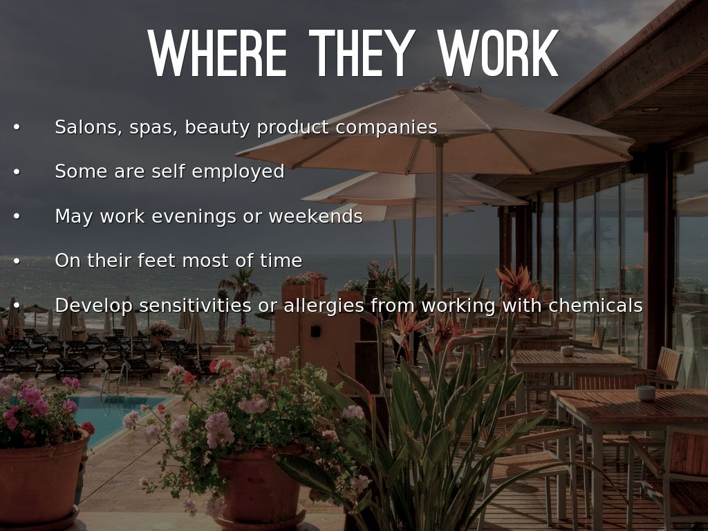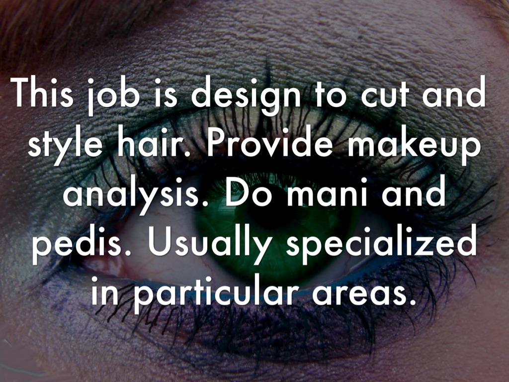 This job is design to cut and style hair. Provide makeup analysis. Do mani and pedis. Usually specialized in particular areas.