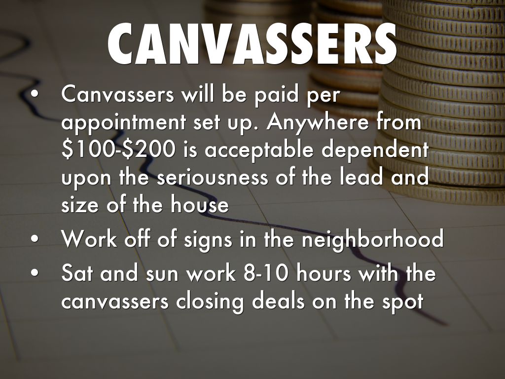 Canvassers will be paid per appointment set up. Anywhere from $100-$200 is acceptable dependent upon the seriousness of the lead and size of the house