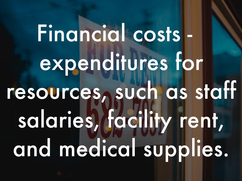 Financial costs - expenditures for resources, such as staff salaries, facility rent, and medical supplies.