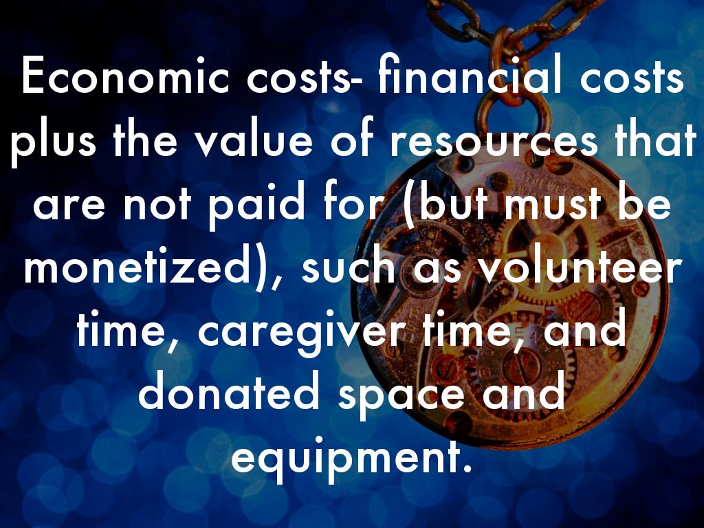 Economic costs- financial costs plus the value of resources that are not paid for (but must be monetized), such as volunteer time, caregiver time, and donated space and equipment.