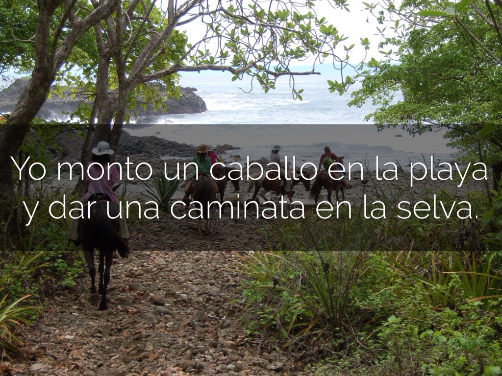Yo monto un caballo en la playa y dar una caminata en la selva.