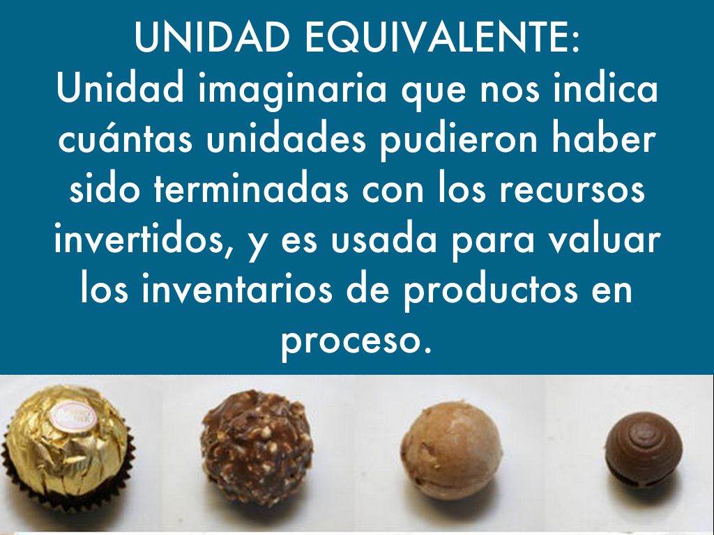 UNIDAD EQUIVALENTE: Unidad imaginaria que nos indica cuántas unidades pudieron haber sido terminadas con los recursos invertidos, y es usada para valuar los inventarios de productos en proceso.