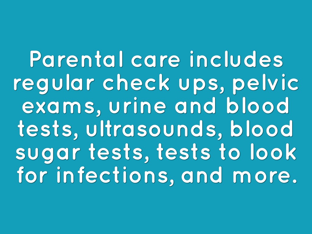 Parental care includes regular check ups, pelvic exams, urine and blood tests, ultrasounds, blood sugar tests, tests to look for infections, and more.