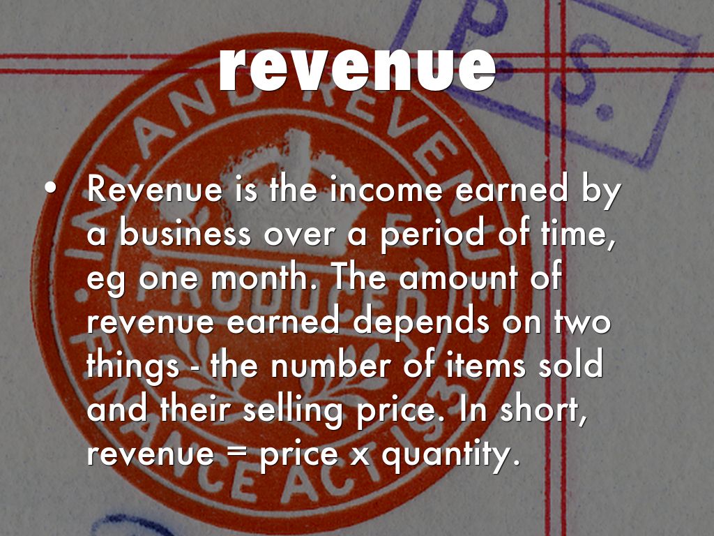 Revenue is the income earned by a business over a period of time, eg one month. The amount of revenue earned depends on two things - the number of items sold and their selling price. In short, revenue = price x quantity.