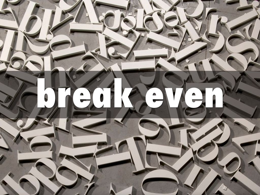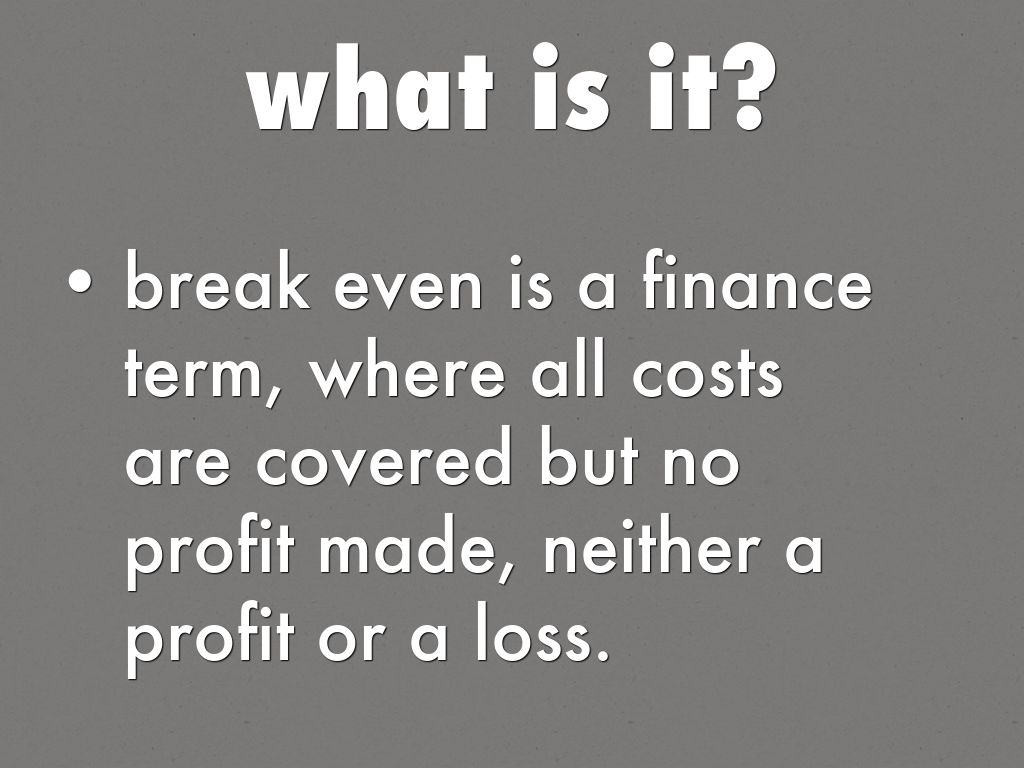 break even is a finance term, where all costs are covered but no profit made, neither a profit or a loss.
