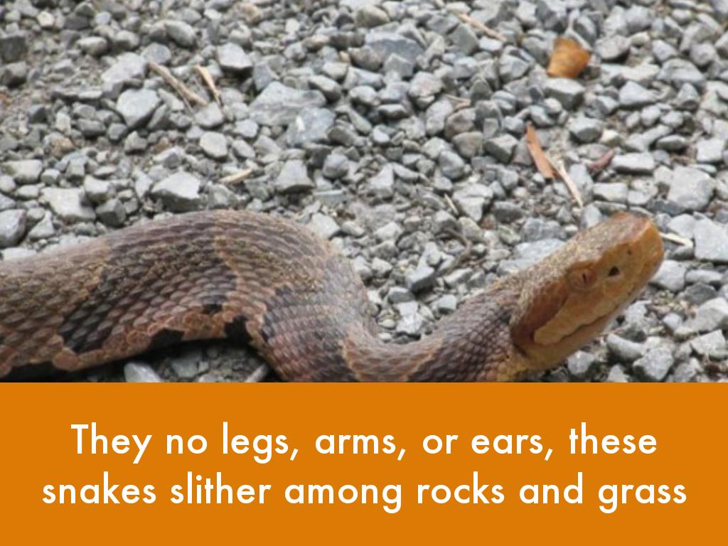 They no legs, arms, or ears, these snakes slither among rocks and grass