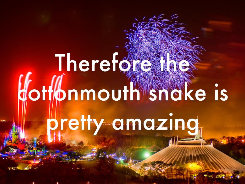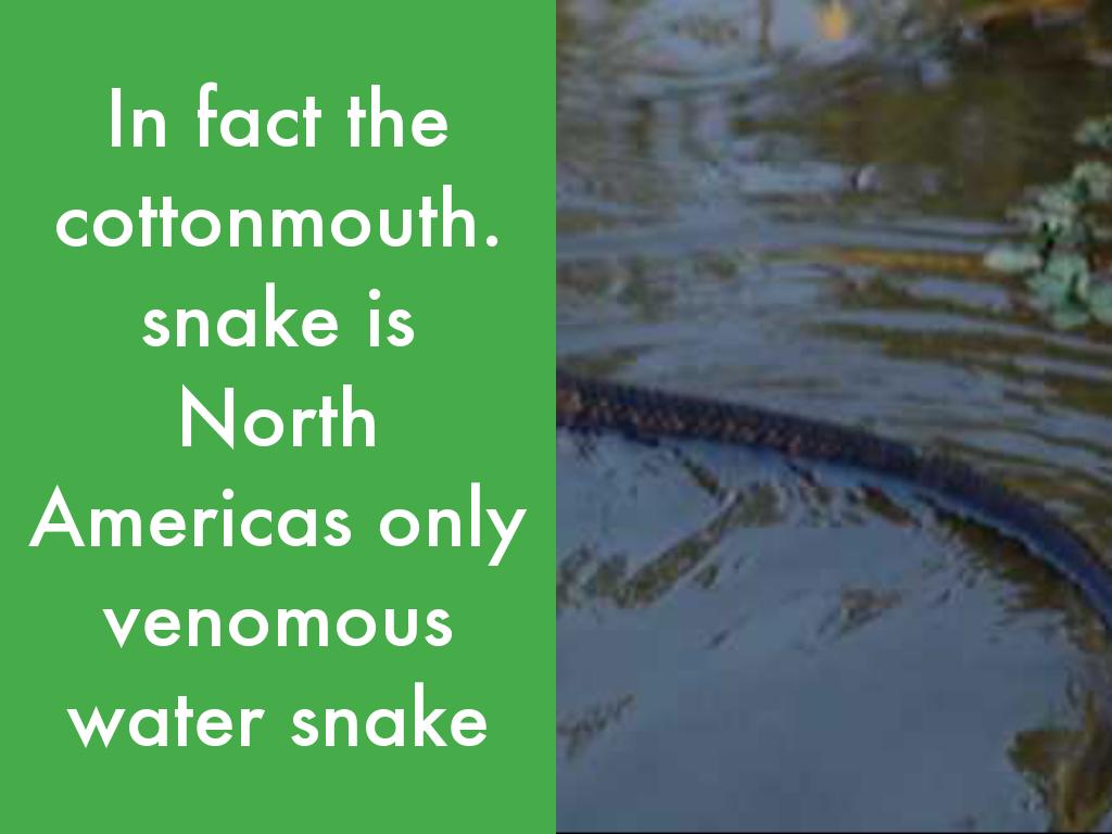 In fact the cottonmouth. snake is North Americas only venomous water snake
