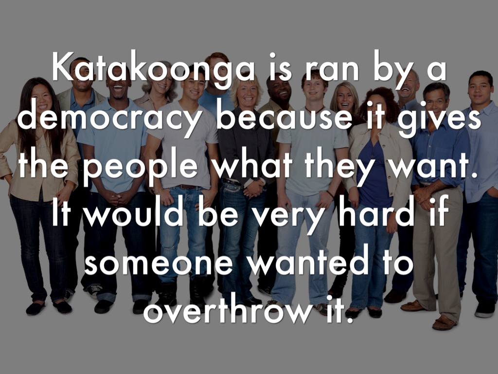 Katakoonga is ran by a democracy because it gives the people what they want. It would be very hard if someone wanted to overthrow it.