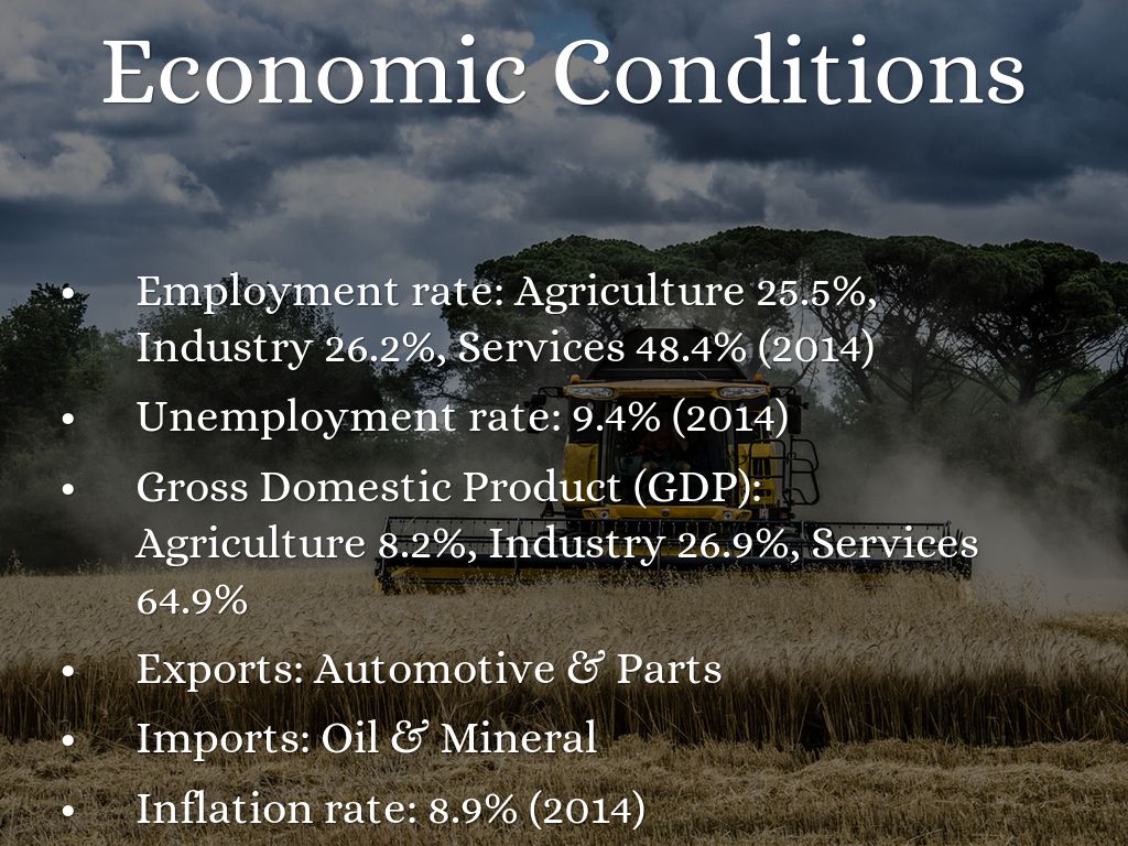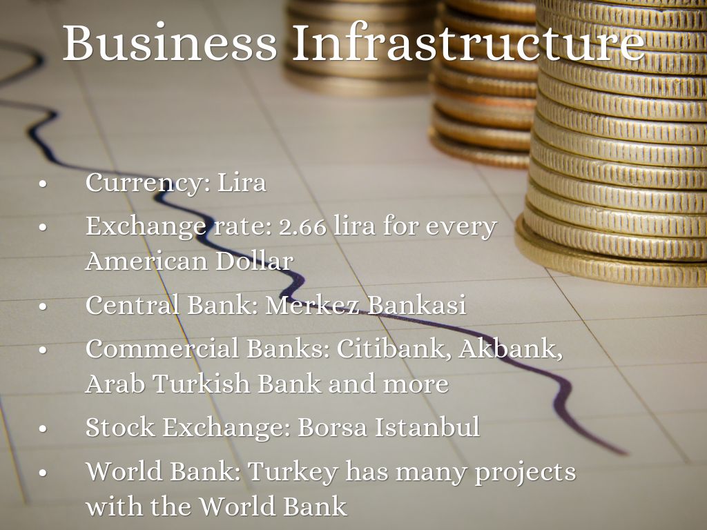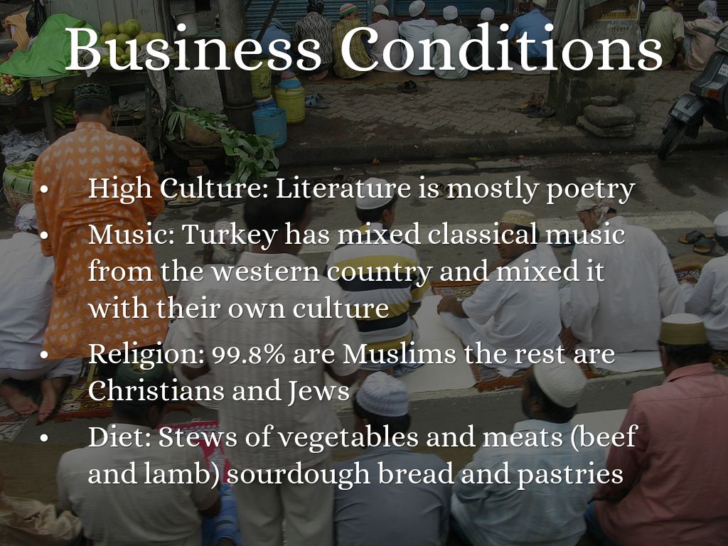 • Country Specific Considerations: Turkey is a growing economy, it has grown 5% since 2010 and its top export industry is Automotive and Precious Stones. Their major GDP is their services and the second one is the industry.