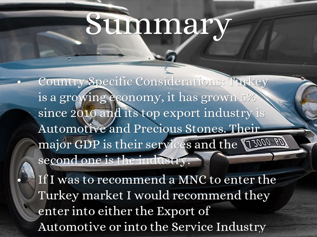 • If I was to recommend a MNC to enter the Turkey market I would recommend they enter into either the Export of Automotive or into the Service Industry