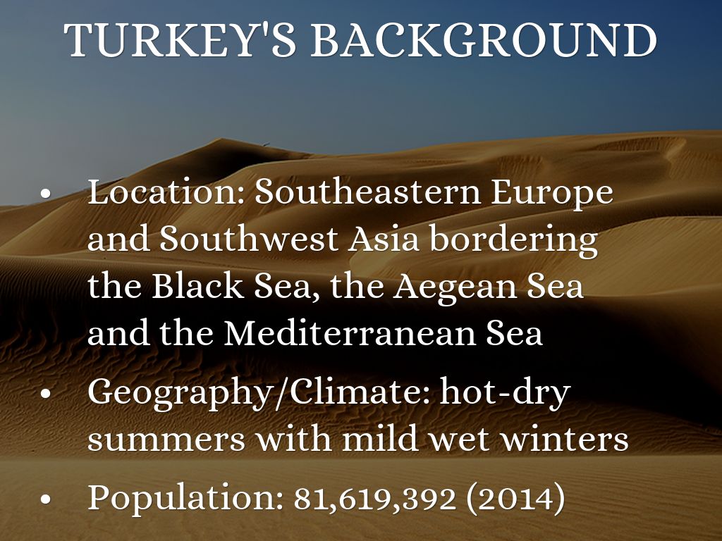 • Location: Southeastern Europe and Southwest Asia bordering the Black Sea, the Aegean Sea and the Mediterranean Sea