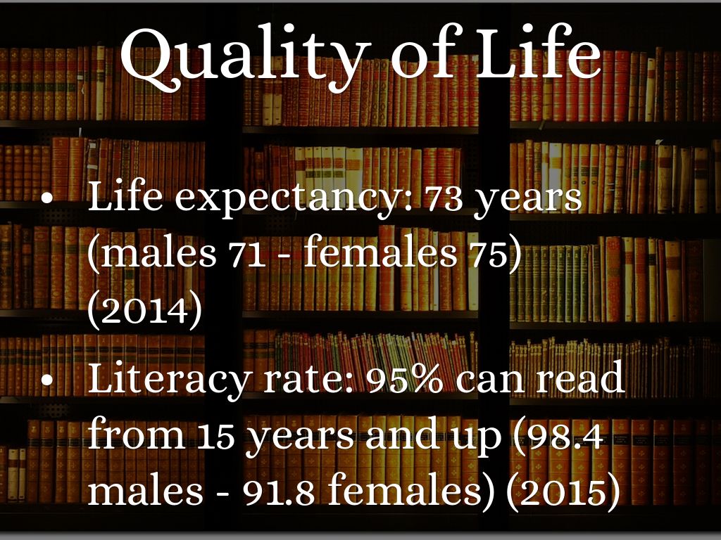 • Life expectancy: 73 years (males 71 - females 75) (2014)