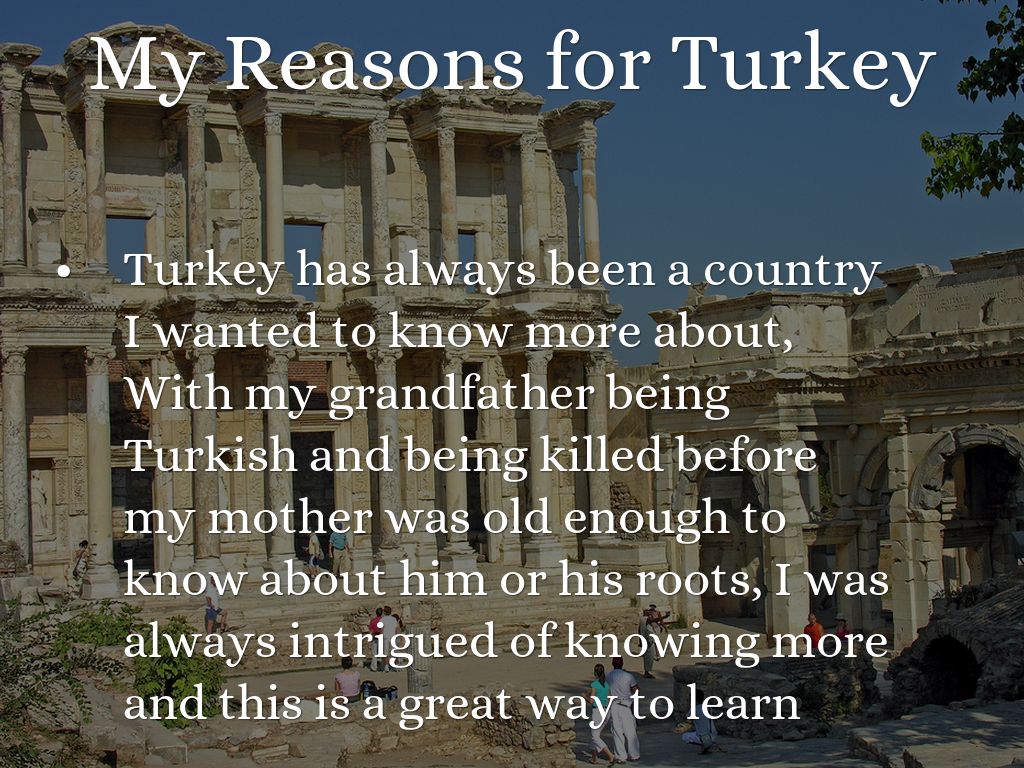 • Turkey has always been a country I wanted to know more about, With my grandfather being Turkish and being killed before my mother was old enough to know about him or his roots, I was always intrigued of knowing more and this is a great way to learn