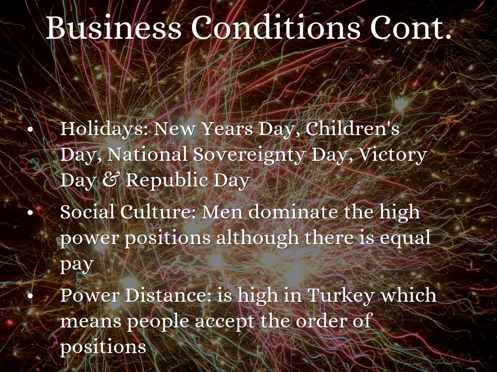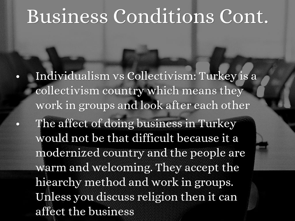 • The affect of doing business in Turkey would not be that difficult because it a modernized country and the people are warm and welcoming. They accept the hiearchy method and work in groups. Unless you discuss religion then it can affect the business