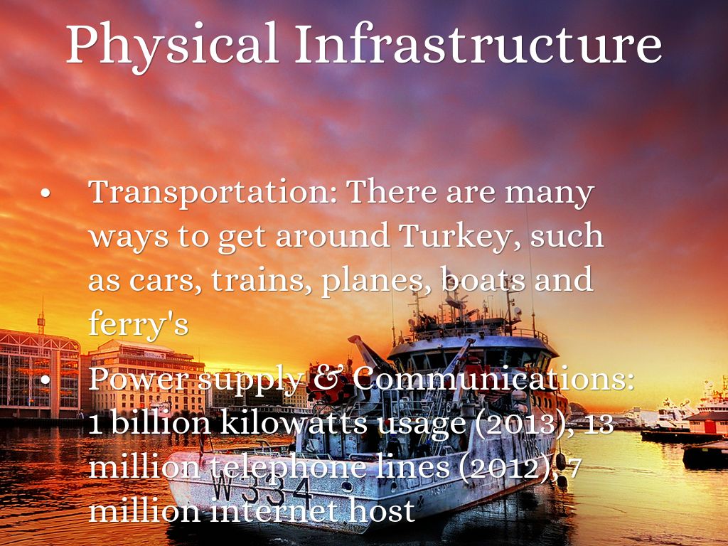 • Transportation: There are many ways to get around Turkey, such as cars, trains, planes, boats and ferry's