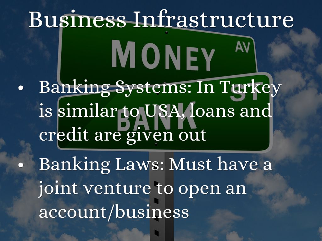 • Banking Systems: In Turkey is similar to USA, loans and credit are given out