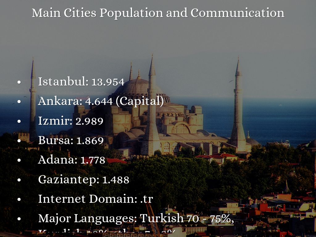 • Major Languages: Turkish 70 - 75%, Kurdish 18% other 7 - 8%
