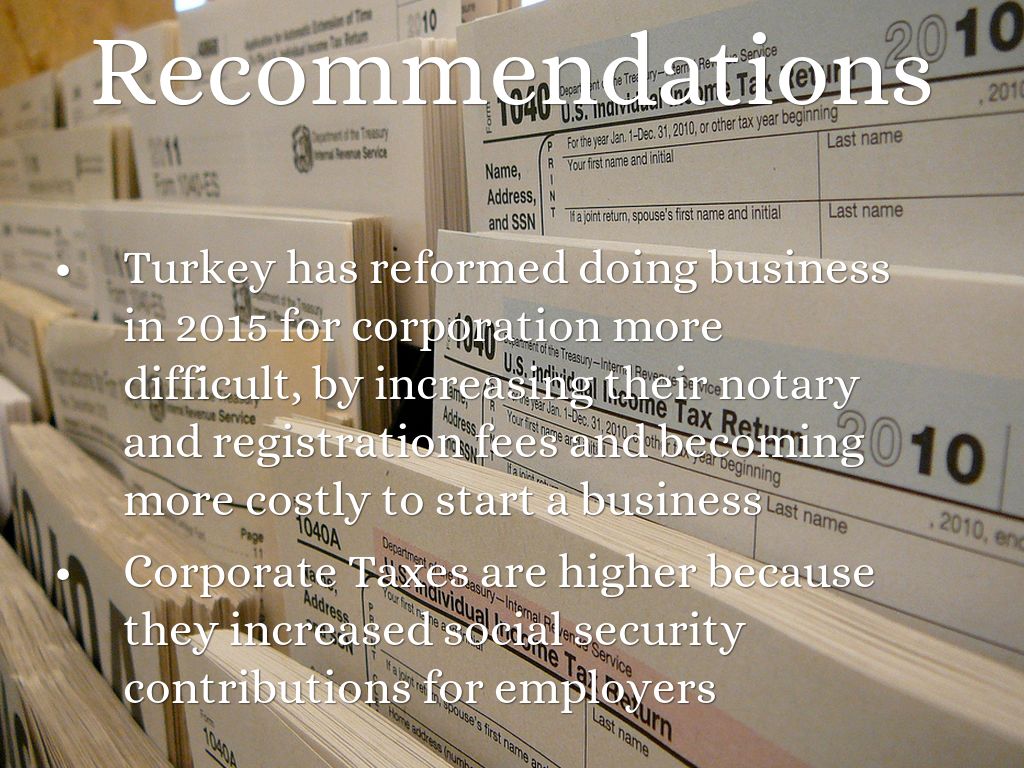 • Turkey has reformed doing business in 2015 for corporation more difficult, by increasing their notary and registration fees and becoming more costly to start a business