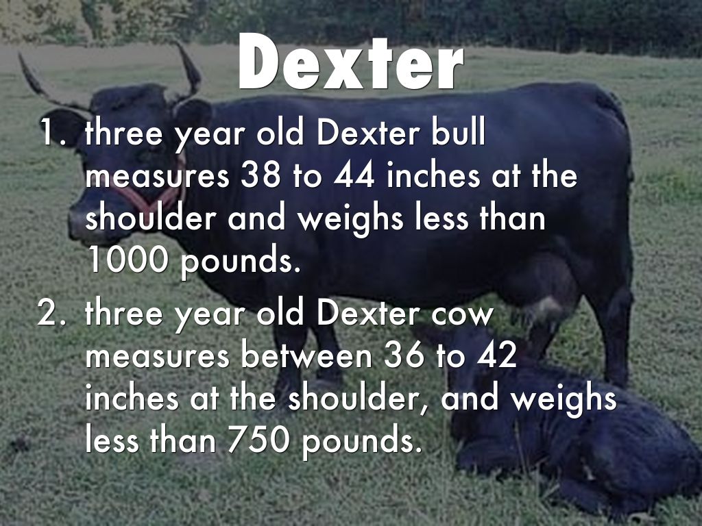 three year old Dexter bull measures 38 to 44 inches at the shoulder and weighs less than 1000 pounds.
