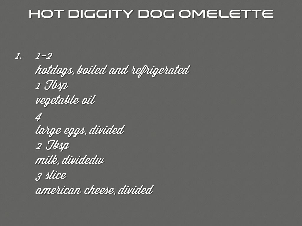 • 1-2 hotdogs, boiled and refrigerated 1 Tbsp vegetable oil 4 large eggs, divided 2 Tbsp milk, dividedw 3 slice american cheese, divided salt and pepper to taste 2 tsp butter, divided 4 slice white or wheat bread, divided