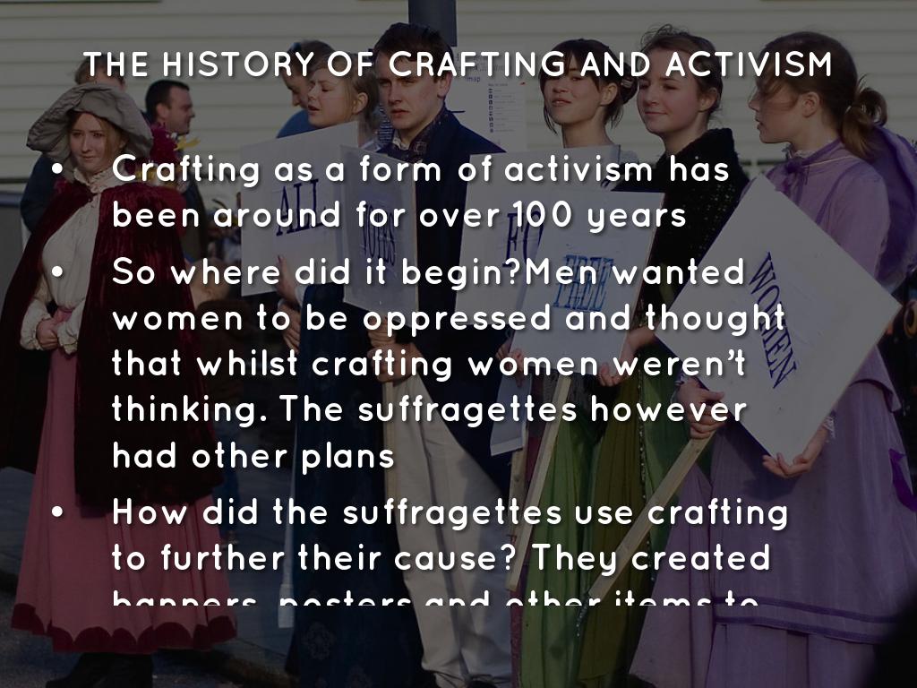 - So where did it begin?Men wanted women to be oppressed and thought that whilst crafting women weren’t thinking. The suffragettes however had other plans