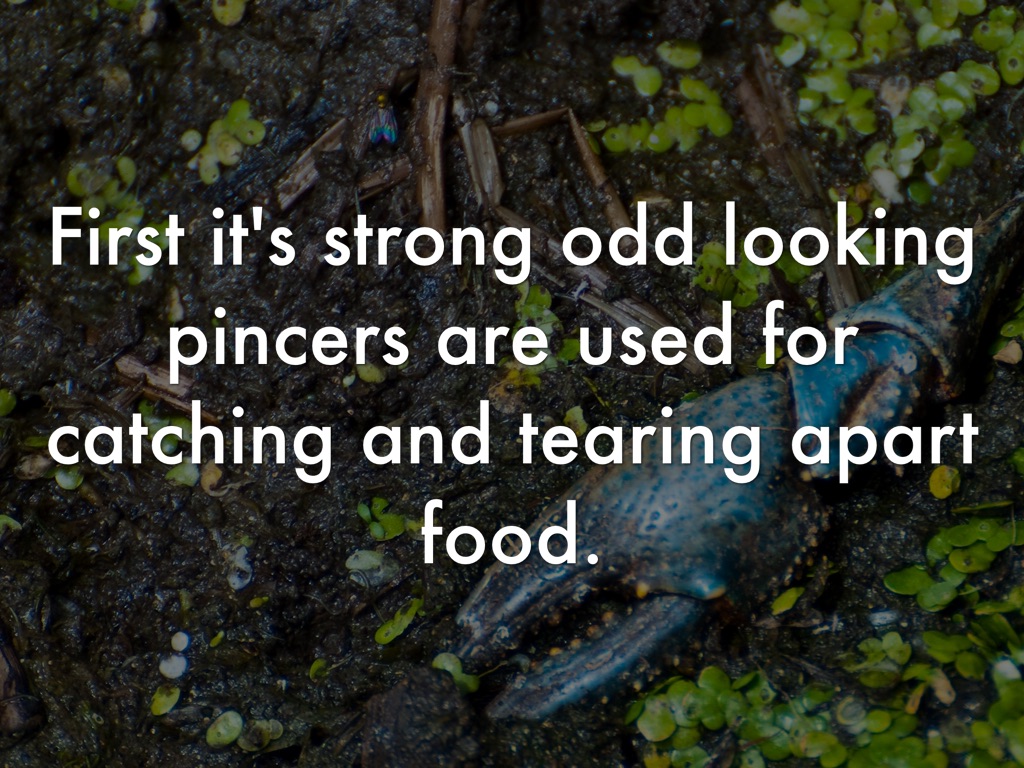First it's strong odd looking pincers are used for catching and tearing apart food.
