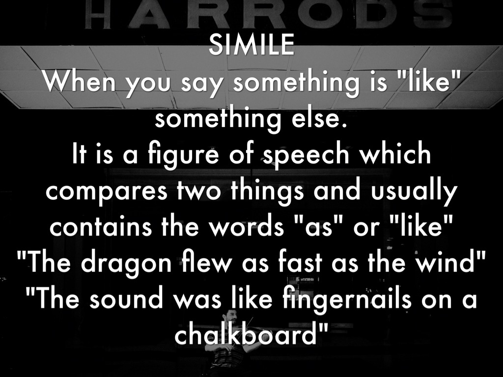 SIMILE When you say something is "like" something else. It is a figure of speech which compares two things and usually contains the words "as" or "like" "The dragon flew as fast as the wind" "The sound was like fingernails on a chalkboard"