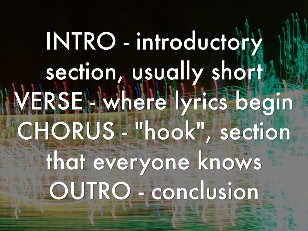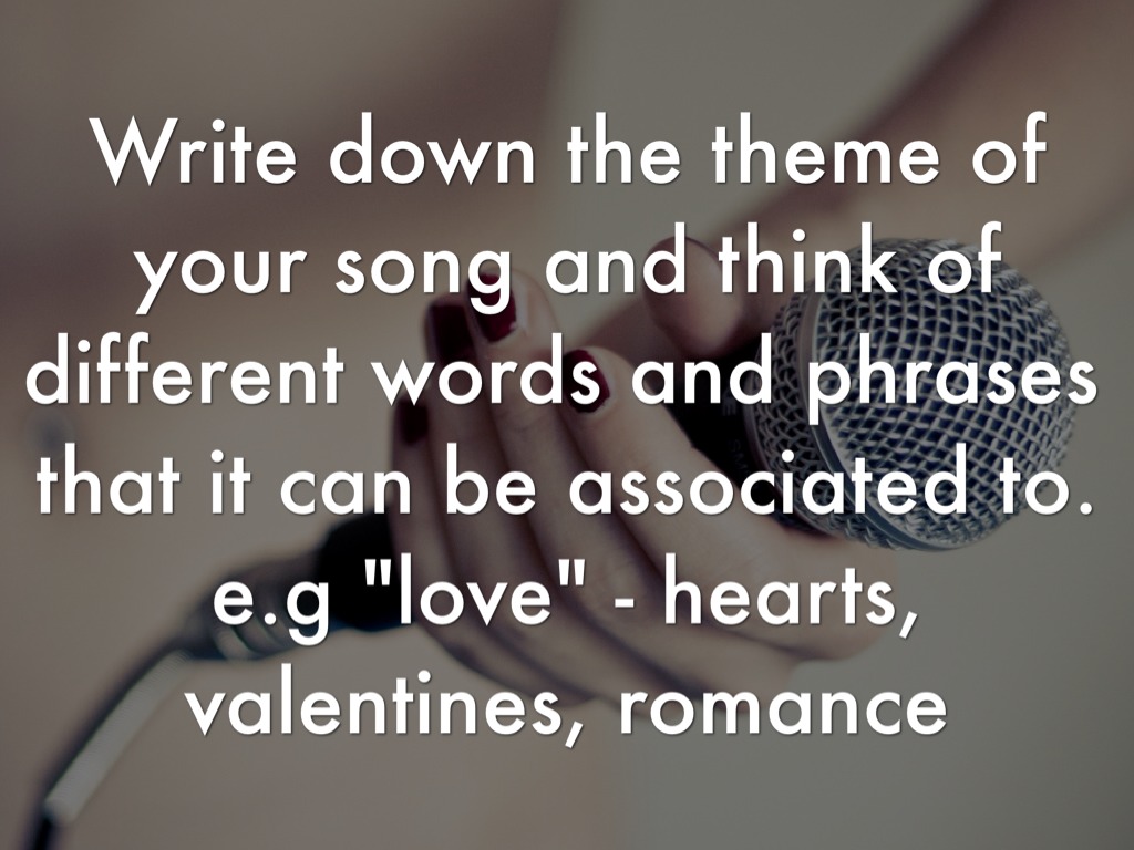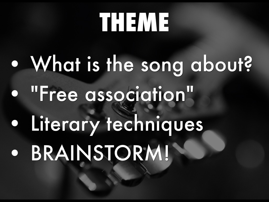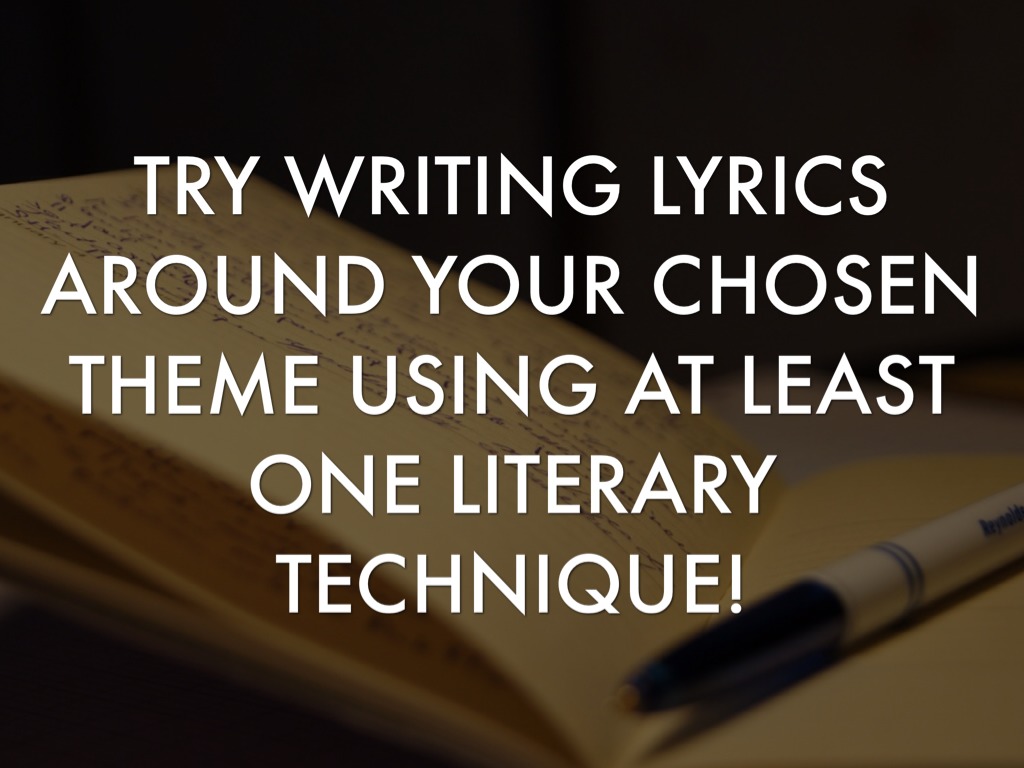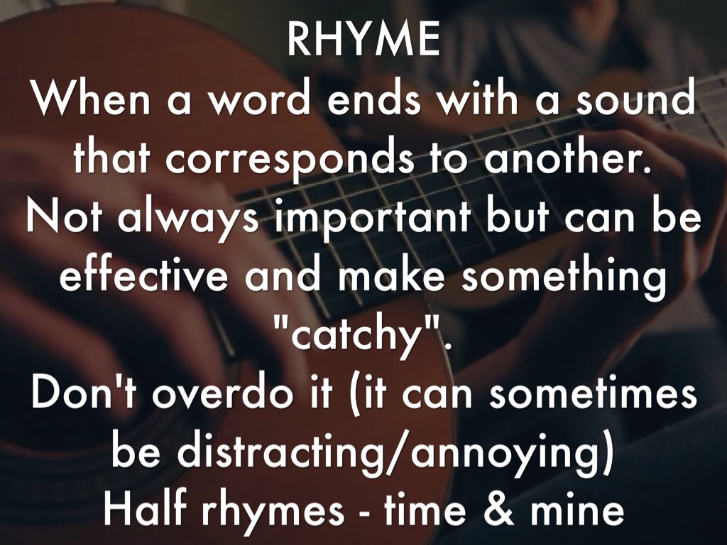 RHYME When a word ends with a sound that corresponds to another. Not always important but can be effective and make something "catchy". Don't overdo it (it can sometimes be distracting/annoying) Half rhymes - time & mine