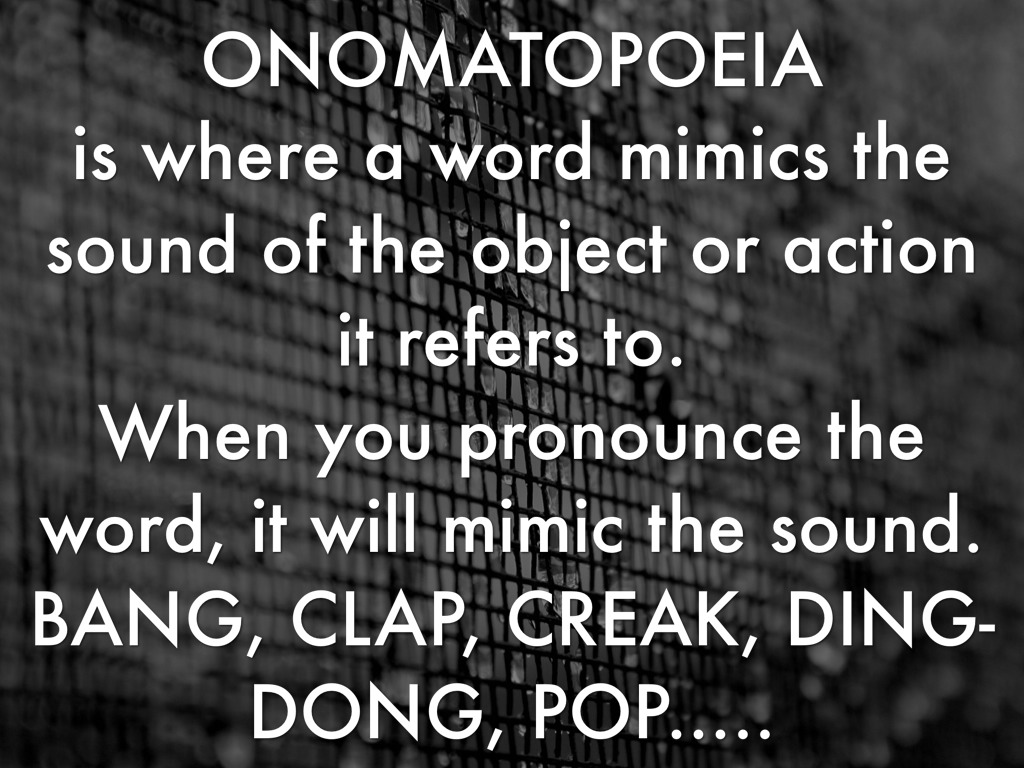 ONOMATOPOEIA is where a word mimics the sound of the object or action it refers to. When you pronounce the word, it will mimic the sound. BANG, CLAP, CREAK, DING-DONG, POP.....