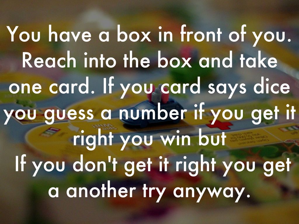 You have a box in front of you. Reach into the box and take one card. If you card says dice you guess a number if you get it right you win but If you don't get it right you get a another try anyway.