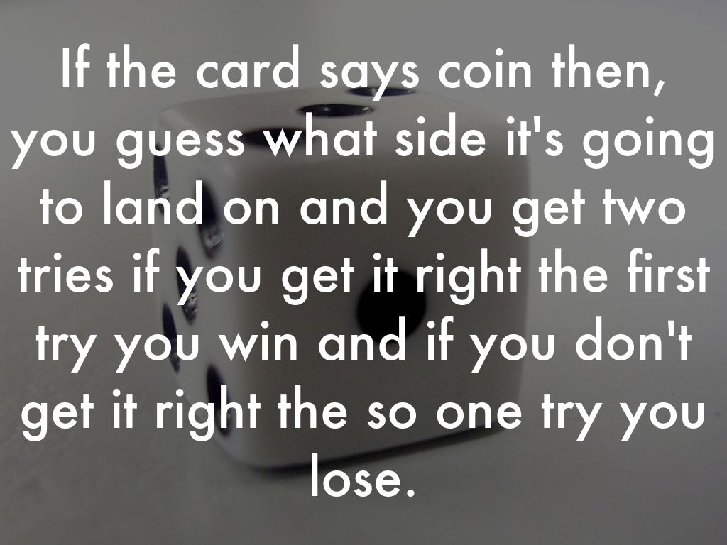 If the card says coin then, you guess what side it's going to land on and you get two tries if you get it right the first try you win and if you don't get it right the so one try you lose.