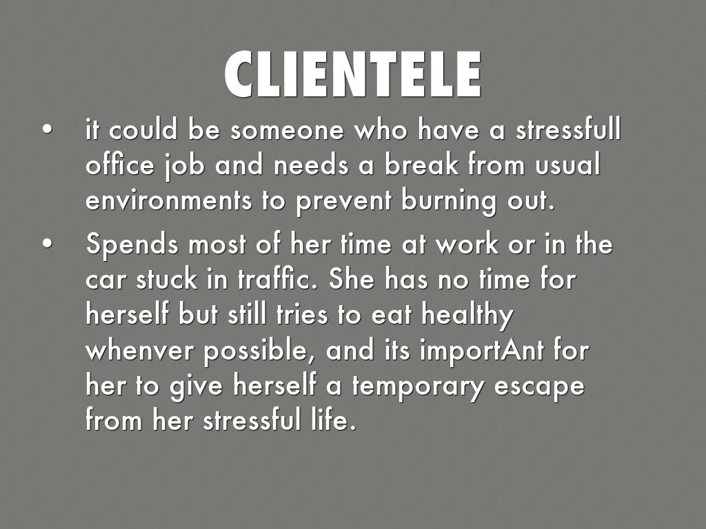 Spends most of her time at work or in the car stuck in traffic. She has no time for herself but still tries to eat healthy whenver possible, and its importAnt for her to give herself a temporary escape from her stressful life.