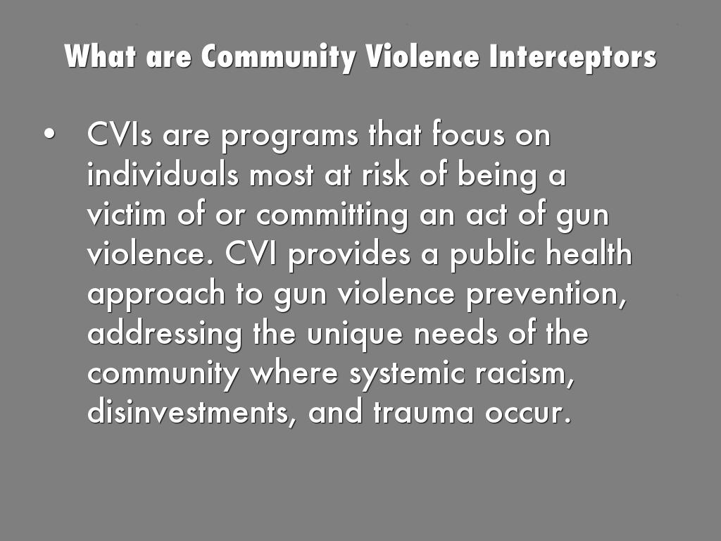 Detect and interrupt (i.e., prevent) potentially violent situations, Identify and change the thinking and behavior of the highest risk transmitters (i.e., those most likely to engage in violence), and Change group norms that support and perpetuate the use of violence. CVG’s method entails analyzing violence clusters and transmission dynamics and uses paraprofessional health workers who are culturally sensitive credible messengers to interrupt transmission and change community norms around the use of violence. This is accomplished by hiring members of the community who have had similar life experiences to those at highest risk of committing acts of violence Staff are trained as community health workers and receive extensive education and coaching in evidence-based methods of mediation, persuasion, behavior change, and norm change — all of which are essential for limiting the spread of outbreaks of violence.