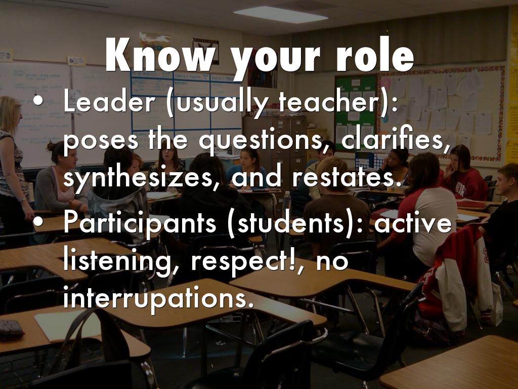 Leader (usually teacher): poses the questions, clarifies, synthesizes, and restates.